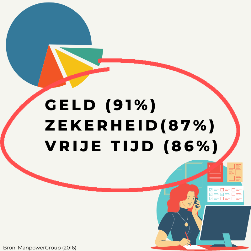 ManpowerGroup deed hier in 2016 grootschalig onderzoek naar (zie: "De carrières van millennials: een visie op 2020"). Ze ondervroegen 19.000 millennials met verschillende beroepen, mét en zonder diploma uit 25 verschillende landen. De belangrijkste 3 prioriteiten waar millennials op letten bij het kiezen van een baan: geld (91%), zekerheid (87%) en vrije tijd (86%).