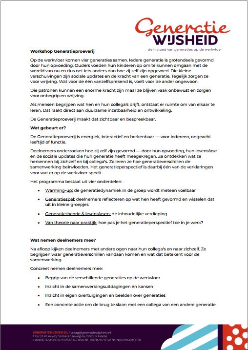 - De Generatieproeverij is geschikt voor alle lagen van de organisatie, van werkvloer tot MT.